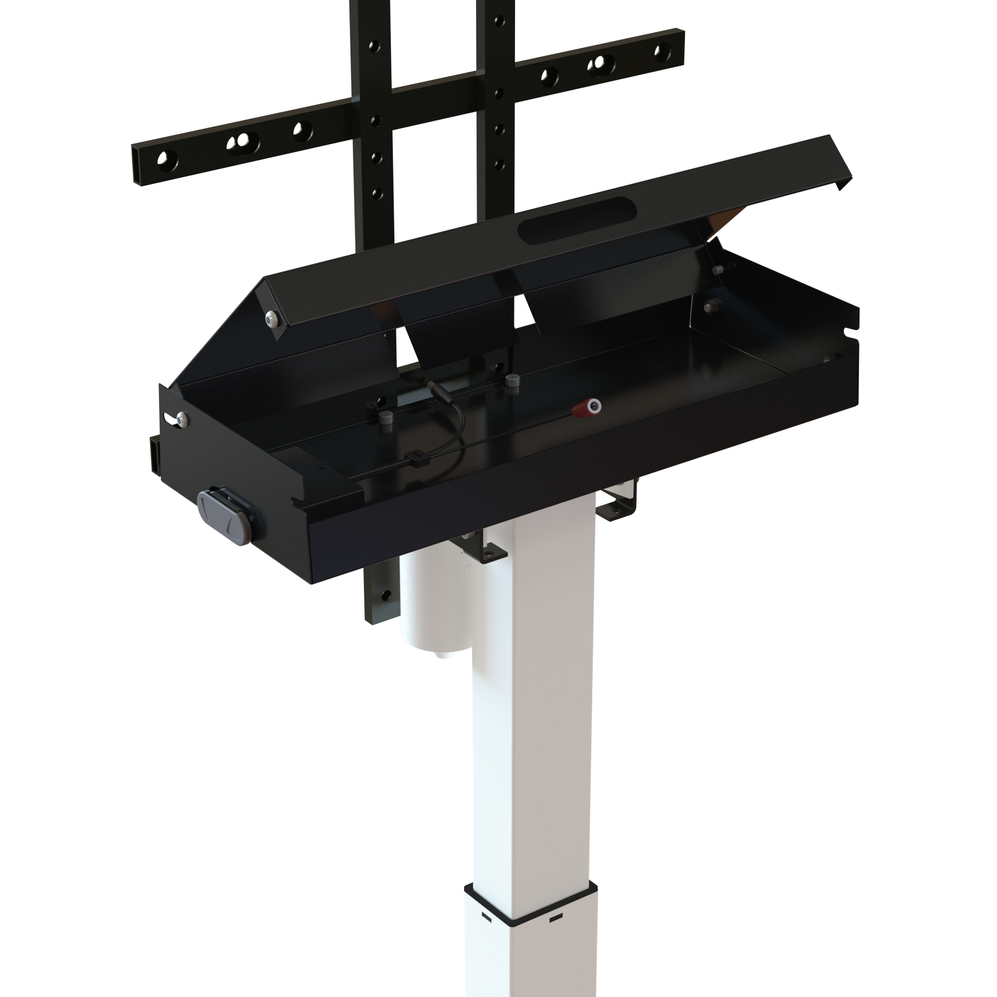 For installations requiring an extended vertical range, the TVS 7W880B SF008XW delivers a generous 880 mm stroke while maintaining a focus on rock-solid stability. The rectangular base plate ensures a secure foundation at any height, making it ideal for showrooms or residential media hubs. The dual-tone finish—white frame with black brackets and storage compartment—ensures a clean appearance by hiding all hardware and cable clutter behind the display.