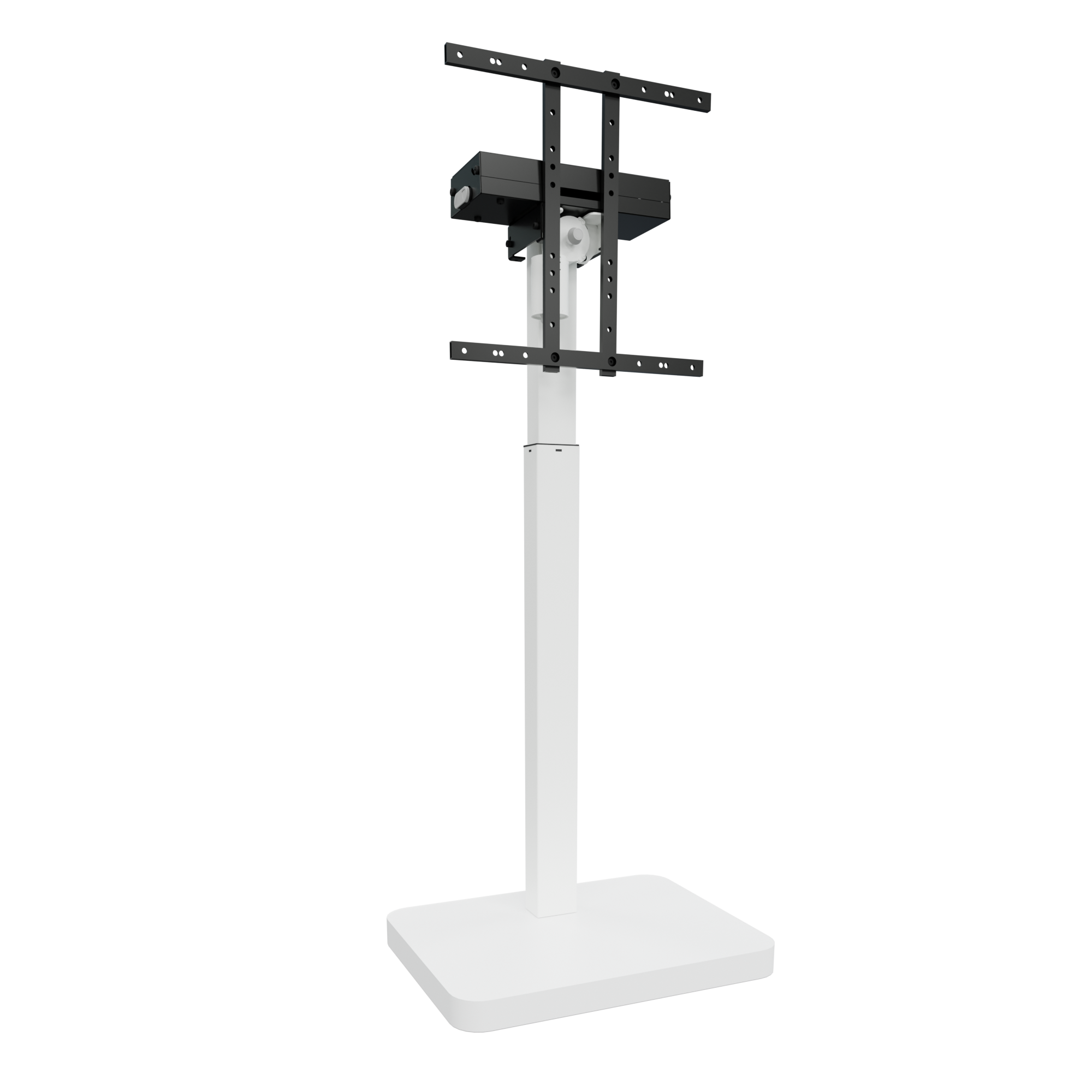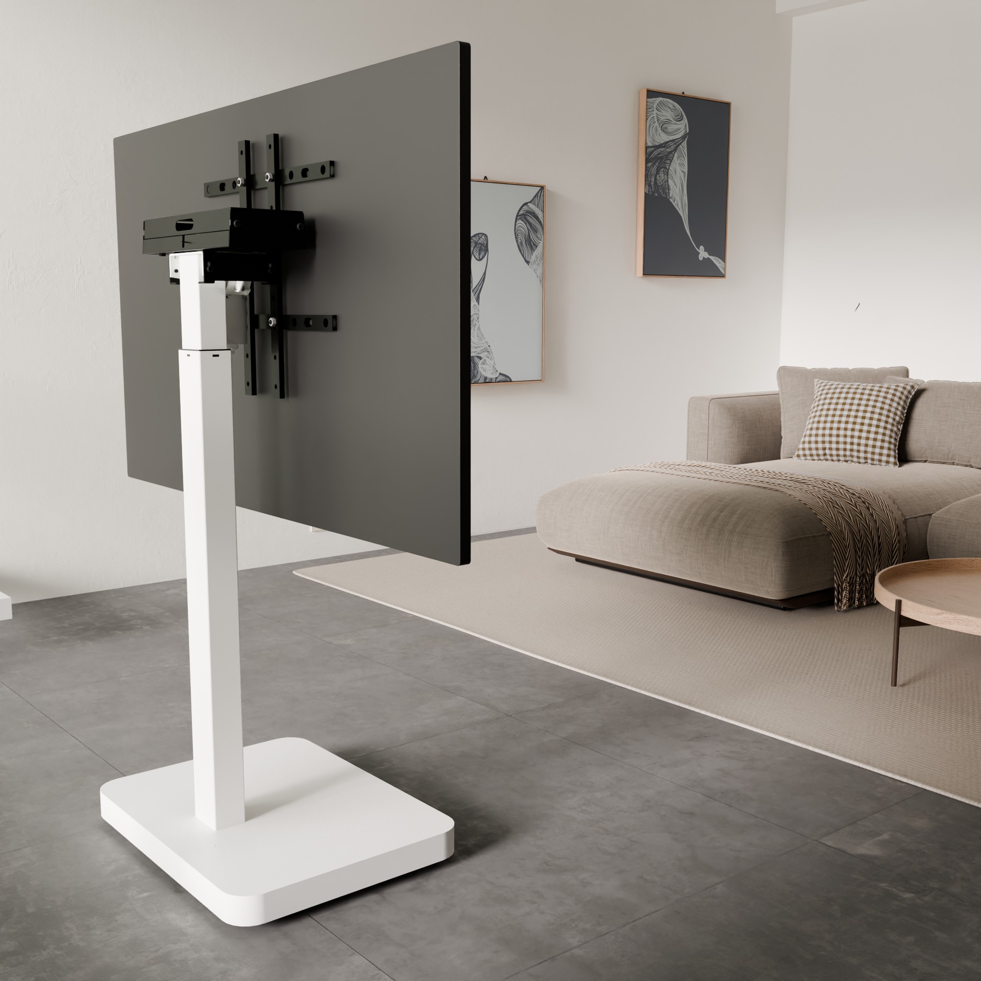 For installations requiring an extended vertical range, the TVS 7W880B SF008XW delivers a generous 880 mm stroke while maintaining a focus on rock-solid stability. The rectangular base plate ensures a secure foundation at any height, making it ideal for showrooms or residential media hubs. The dual-tone finish—white frame with black brackets and storage compartment—ensures a clean appearance by hiding all hardware and cable clutter behind the display.