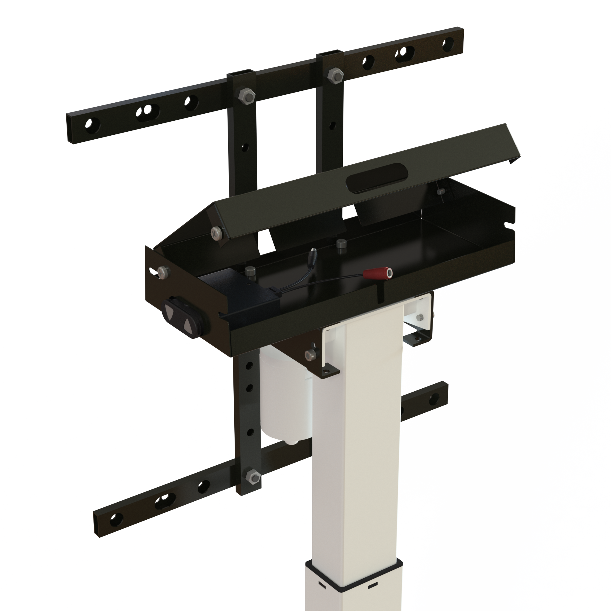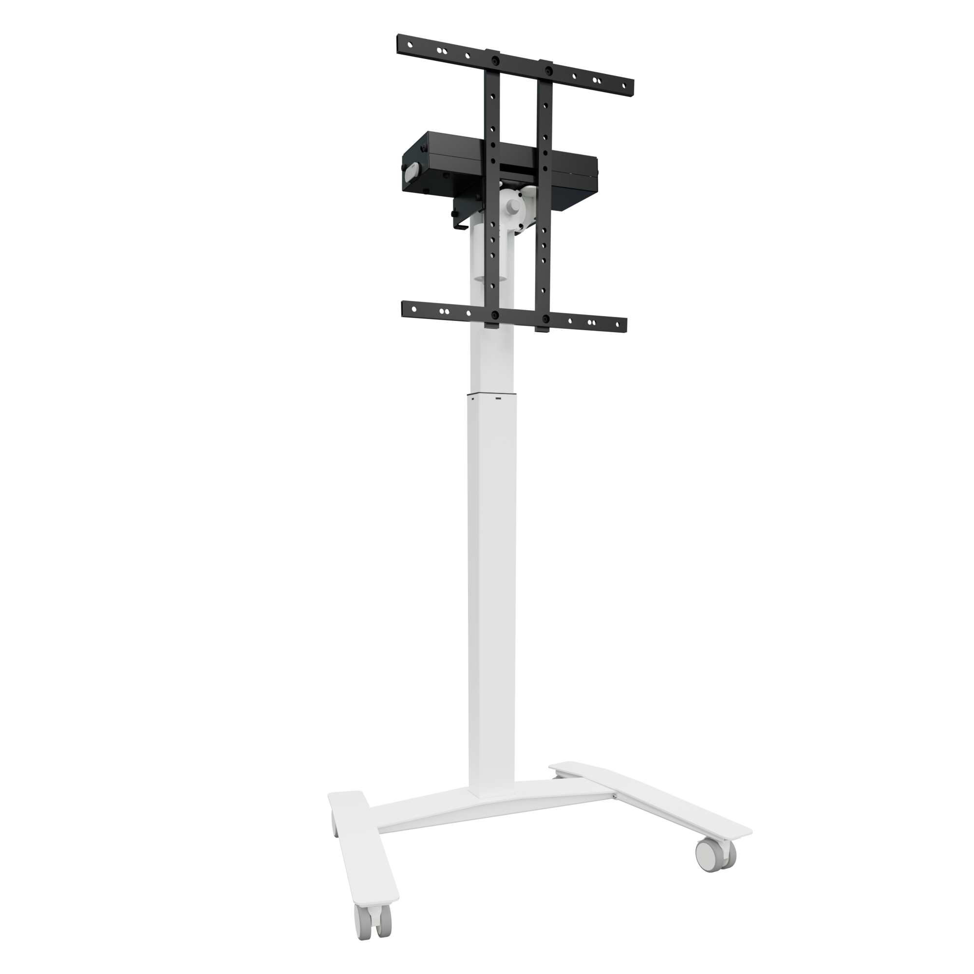 The TVS 7W880B SF007XW combines an expansive 880 mm stroke with a technical H-base frame, designed specifically to ensure stability during high-reach professional use. This model is the premier choice for boardrooms where screen height and mobility are essential. The contrast between the white frame and the black-finished storage box ensures that power strips and messy wiring never distract from the presentation or the surrounding interior.